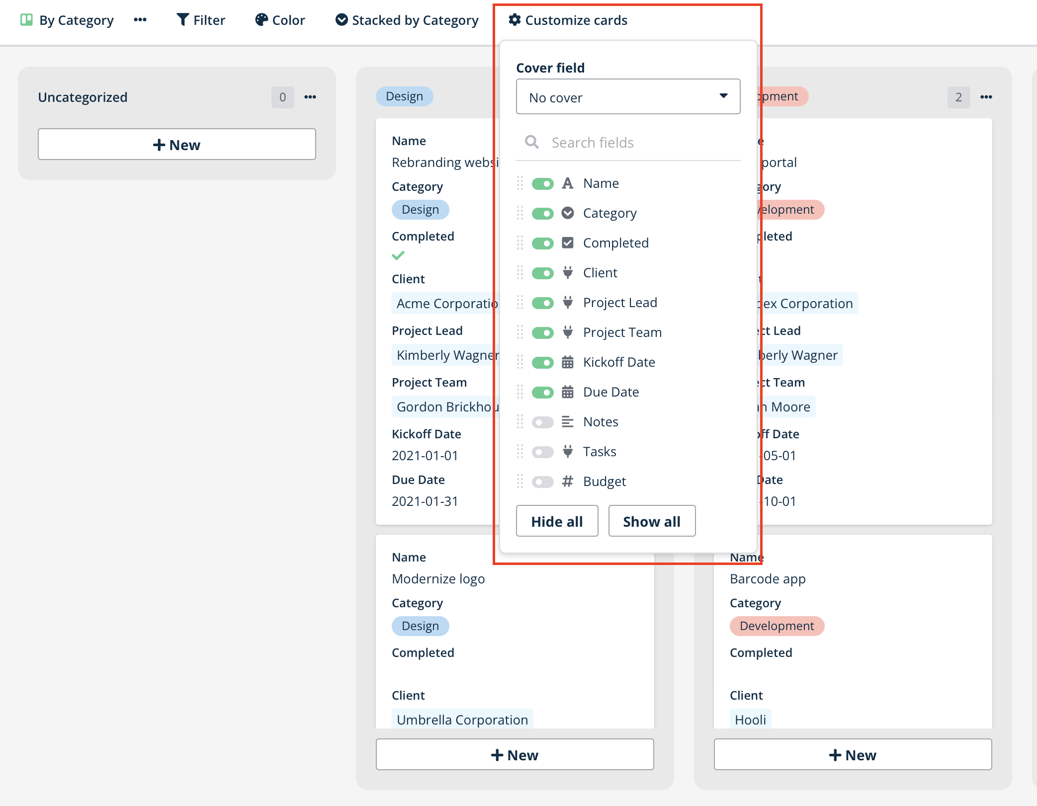 Control what information displays on kanban cards to show the most relevant data for quick decision-making.